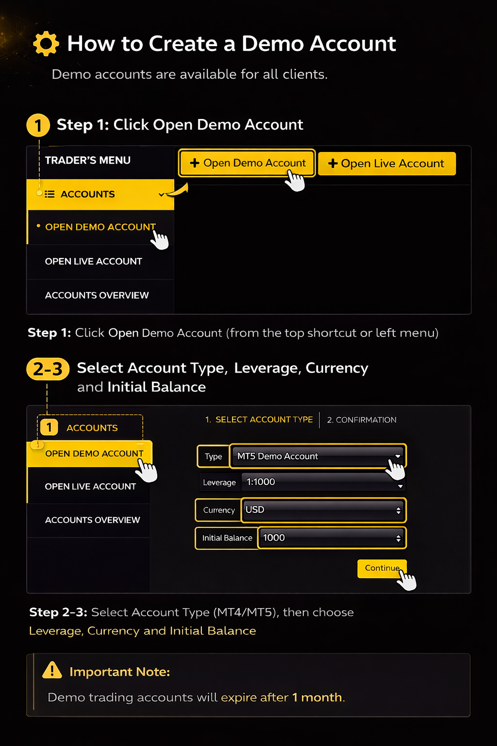 Note: Demo trading accounts will automatically expire after 1 month.